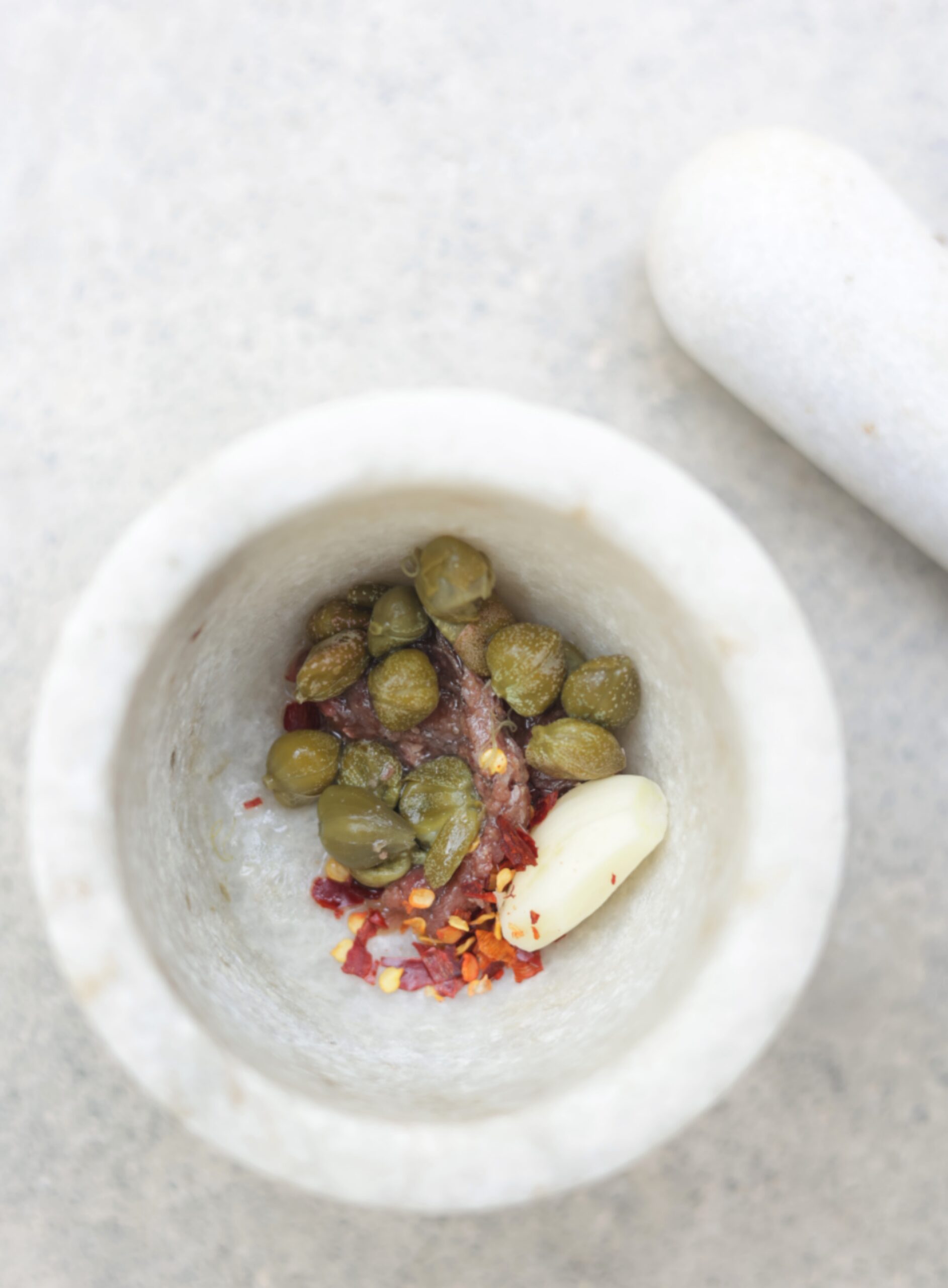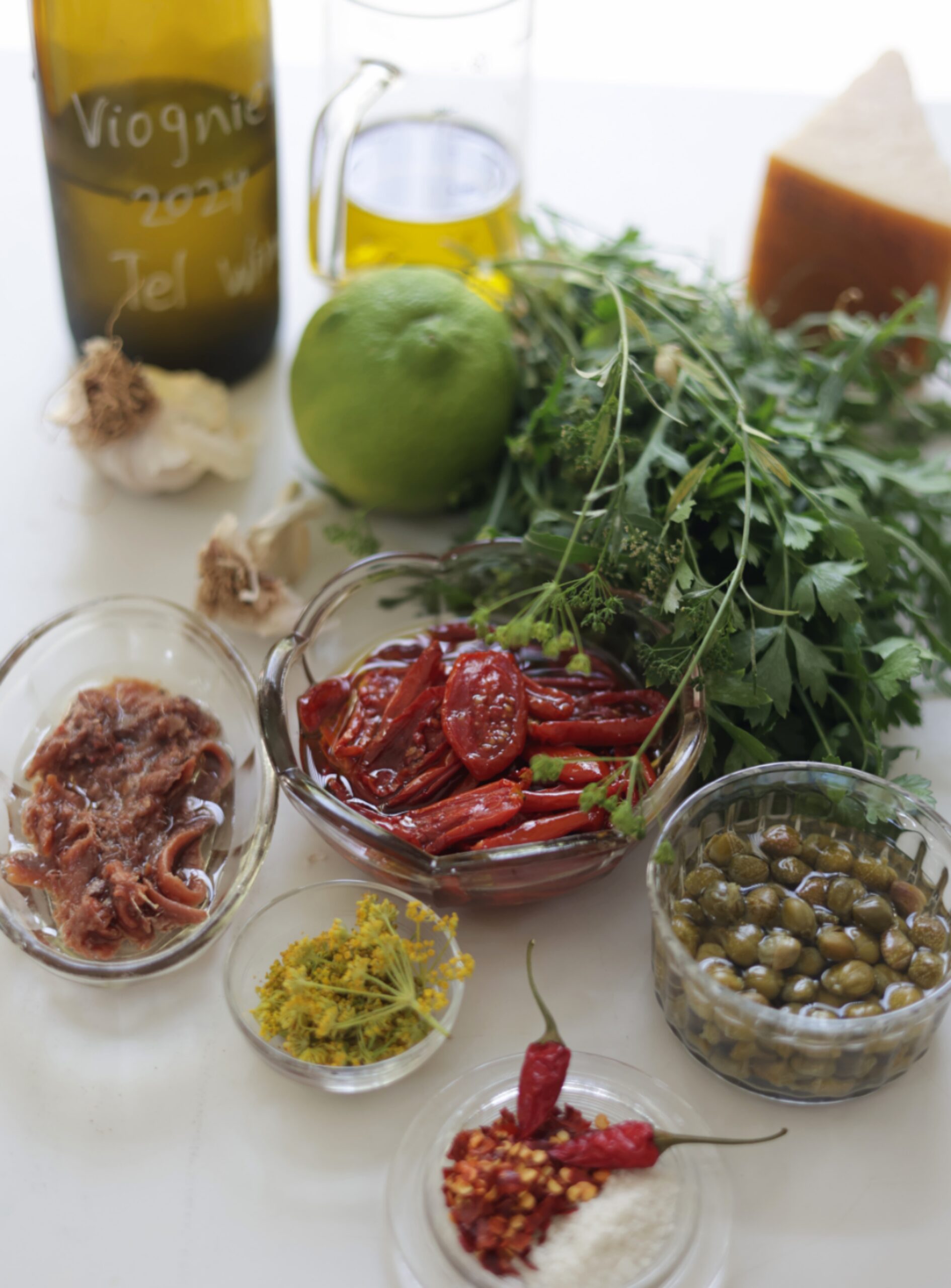 כמקובל במחוזות הדרום האיטלקי הצטרפו לעגבניות מרוכזות המרקם והטעם פילטים של אנשובי, שום, צלפים כבושים, קליפת לימון והרבה שמן זית. שילוב שמבשר רק טוב.