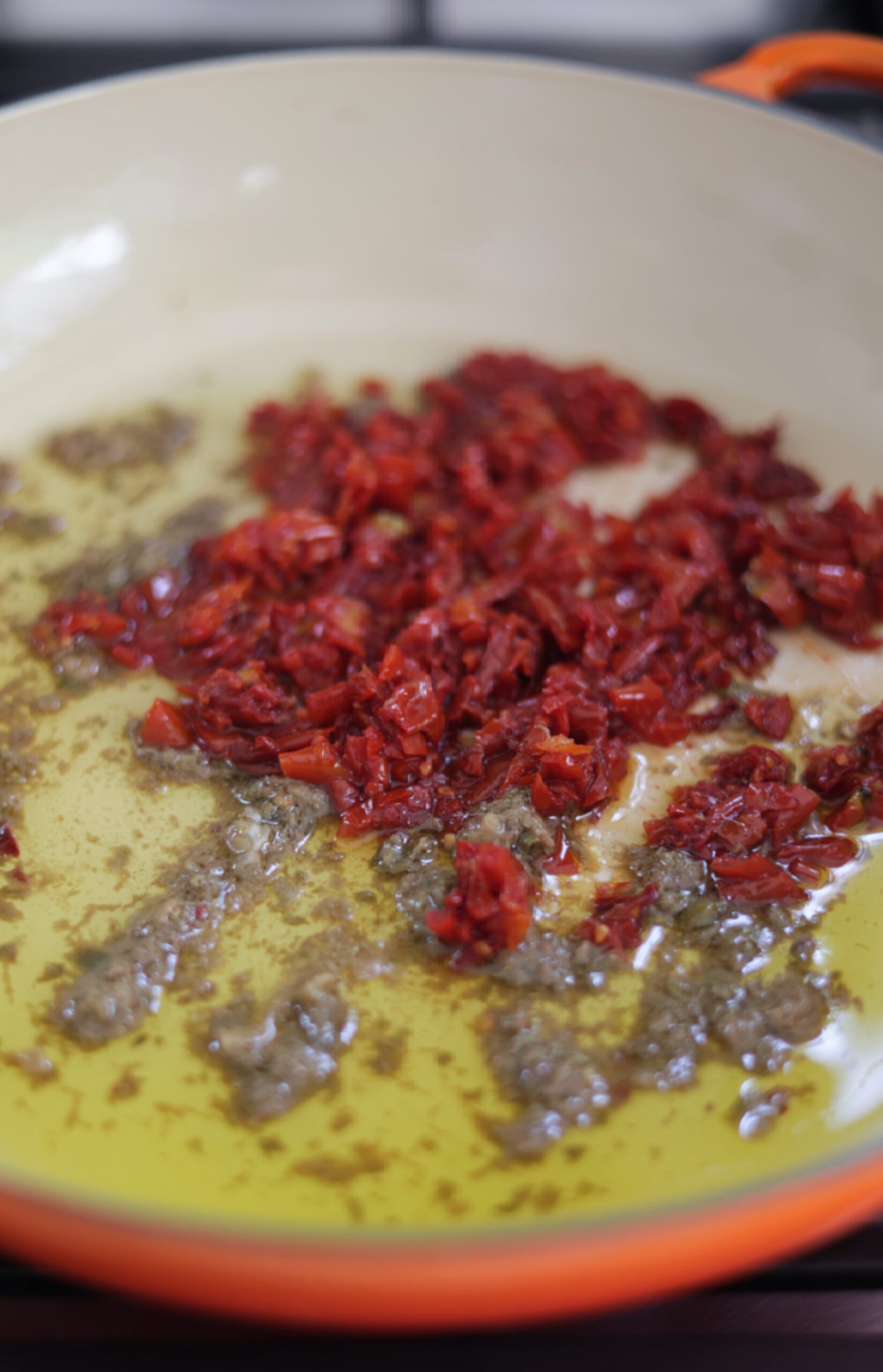 בסיר נמוך ורחב שמים שמן זית ואת משחת האנשובי. מטגנים תוך ערבוב, עד שהמשחה נמסה אל תוך השמן. מוסיפים עגבניות מיובשות ומטגנים תוך ערבוב עד שמתקבלת בסיר תערובת אחידה והעגבניות בוהקות באדום עז.