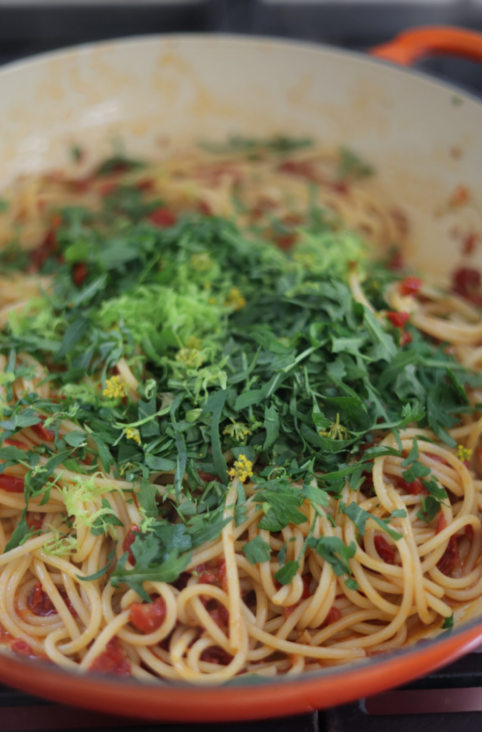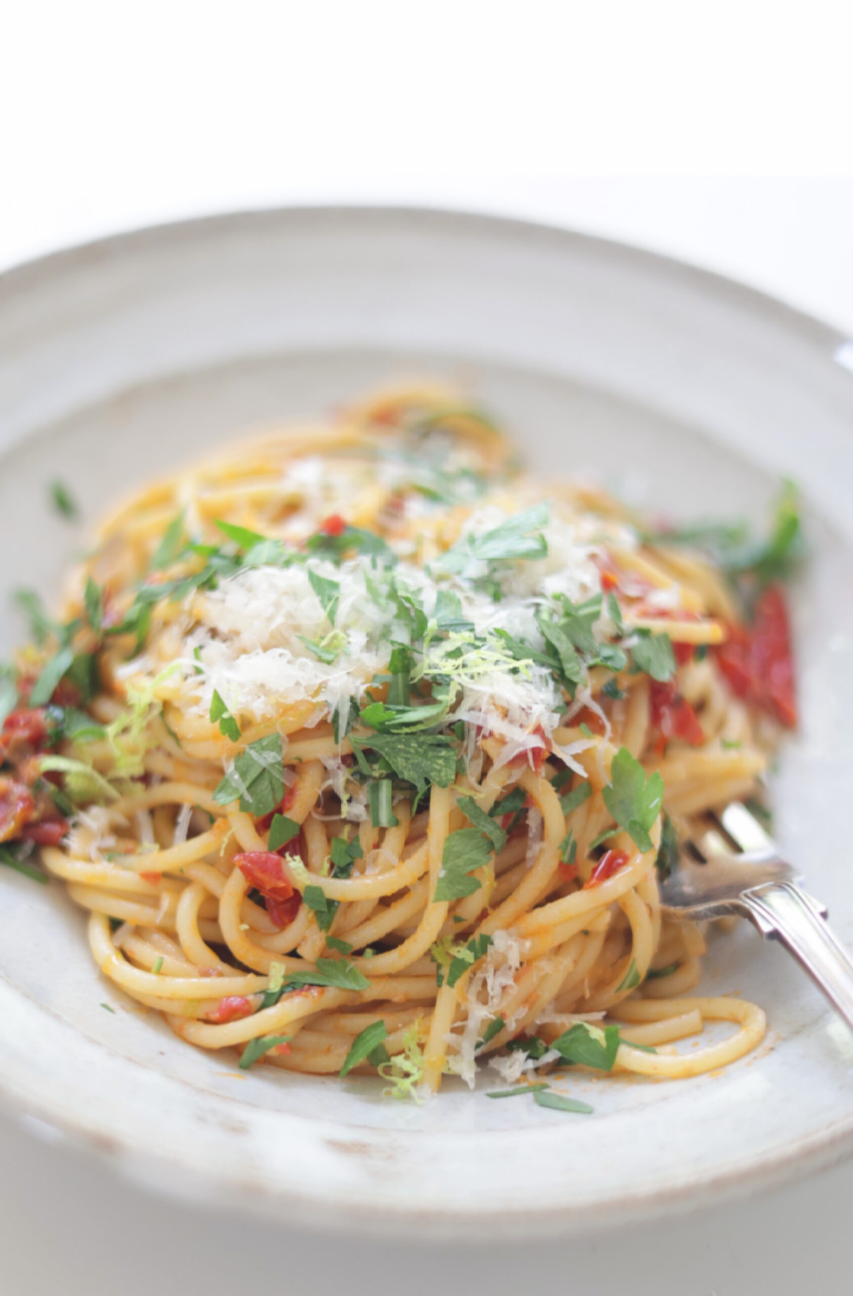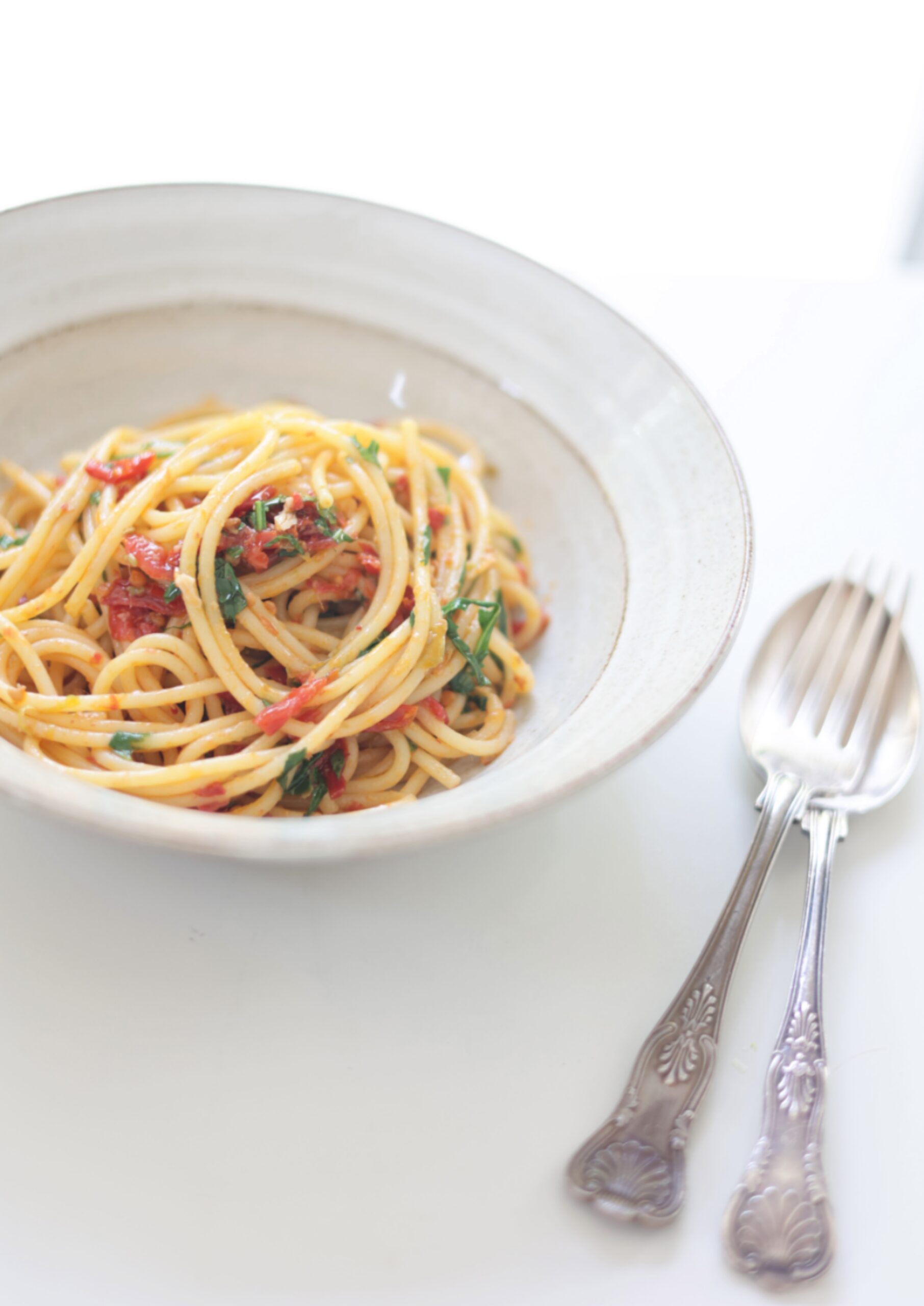 השבוע נפגשנו במטבח לבשל יחד גרסה דרומית מהירה וטעימה של פסטה קיצית עם עגבניות מיובשות בתנור. ויתרנו הפעם על לישת בצק וקריצת צורות ממנו ובחרנו בספגטי בסיסי, אותו שלפנו מתוך שקית וזרקנו אחר כבוד לסיר מים רותחים. "פסטה מזלג" מכנים אותה באיטליה, כזו שדורשת גלגול מהיר סביב שיניו של מזלג.