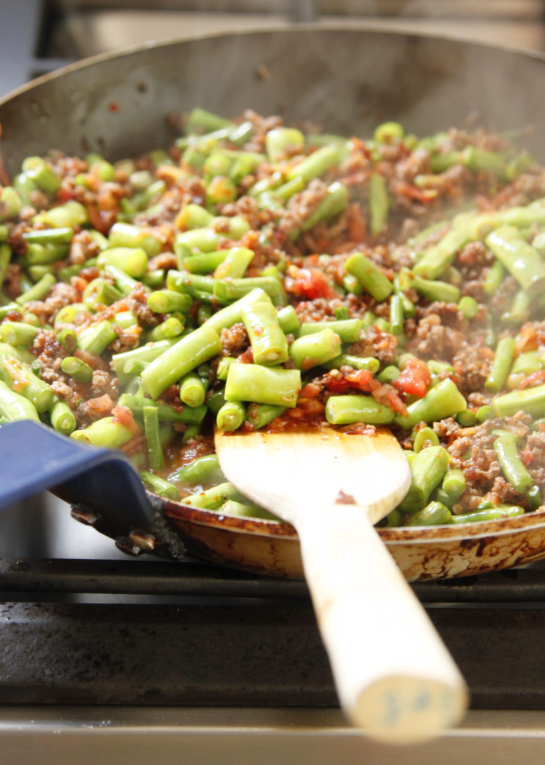 מחממים שמן זית במחבת רחבה מעל להבה חזקה ביותר. מוסיפים בשר ומשחימים היטב מכל הצדדים. מוסיפים שום, מלח, פלפל, צ'ילי ולוביה קצוצה. מטגנים את התערובת תוך ערבוב מדי פעם עד שהלוביה מתרככת.